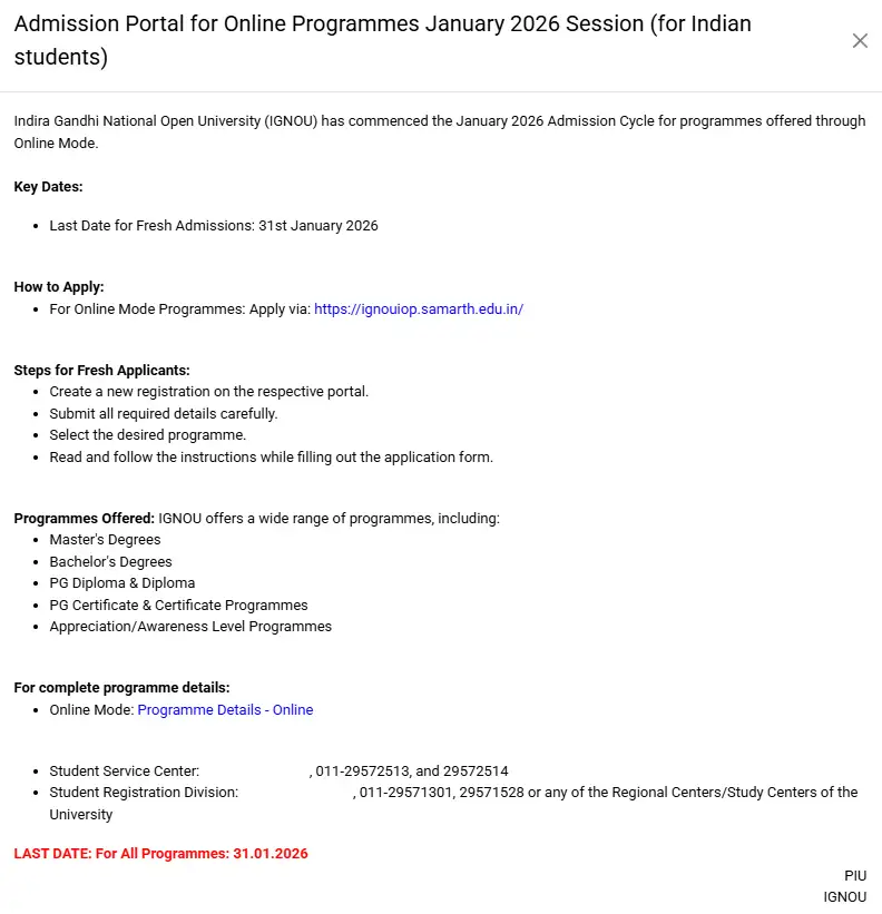 The official website will reveal the closing date for IGNOU admissions for the March 2026 session. Visit the site often for current info.