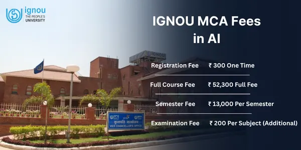 IGNOU offers Online & Distance MCA in Artificial Intelligence Courses in an affordable Fee Structure with a total fee of ₹ 50000 to ₹ 53000 for the entire program. Each semester of the online MCA in artificial intelligence at IGNOU costs ₹ 13000. The total course fee of a program also includes ₹ 300 as a registration fee, ₹ 200 per subject as examination fee and a bridge course of approximately ₹ 2000 (non-IT or mathematical background).