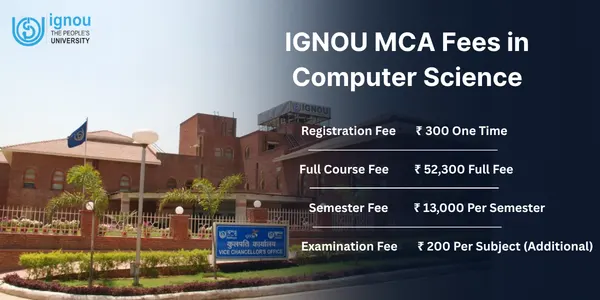The total course fee of an online distance MCA in Computer Science course at IGNOU is ₹ 52300. The total fee of the course includes 13000 per semester (total 4 semesters). Students also need to pay a one-time registration fee of ₹ 300 (non-refundable) and an examination fee of ₹ 200 per subject additional (can be paid semester-wise).